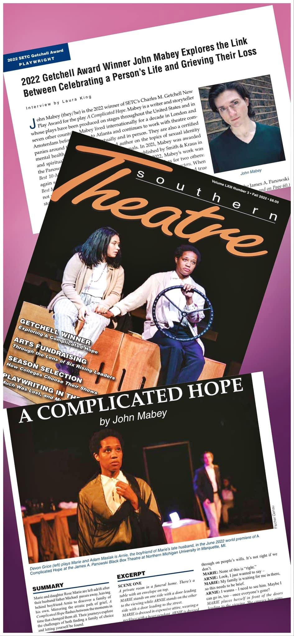 “JOHN MABEY is one of my favorite playwrights. In this wonderful play, we discover so much about the complexities of an interracial relationship, homophobia, guilt and hope, tension and love, and the coping mechanisms we use to deal with the death of a loved one. As I read “A Complicated Hope”, I felt the turmoil of the three characters, who had to face their innermost grief, lost love, and hope in their own way. This is an excellent play. There is so much to learn, feel, and enjoy! Please read and produce this play!”