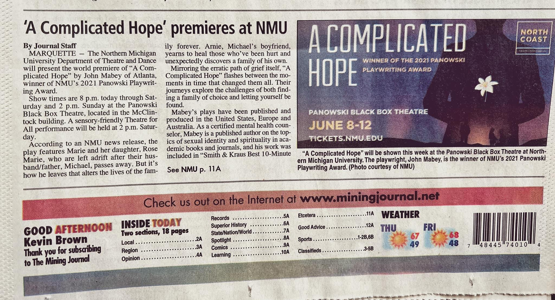 “The play tackles life’s biggest occasions (love, grief, loss, family). In Mabey’s skilled hands, we are gifted with a personal story that is everyone’s. We know these characters, we root for their journeys. We forgive foibles. We hope for the best. There is more than a complicated hope at play here. There is complicated love, a complicated family, and a sense of gratitude that with all the complications, we are the better for them.”